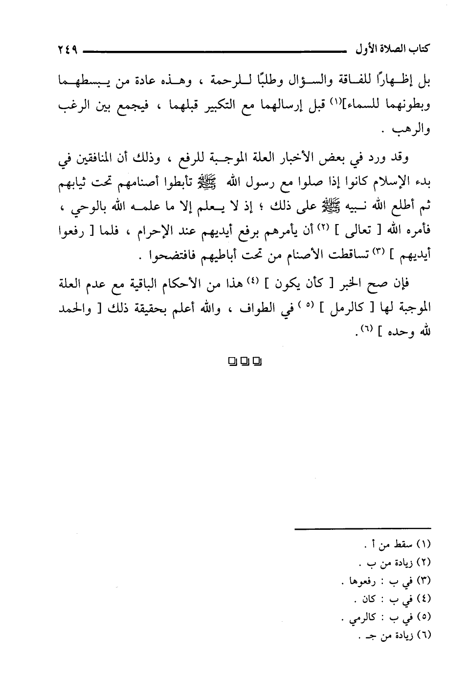 وقد ورد في بعض الأخبار العلة الموجبة للرفع، وذلك أن المنافقين في بدء الإِسلام كانوا إذا صلوا مع رسول الله - صلى الله عليه وسلم - تأبطوا أصنامهم تحت ثيابهم ثم أطلع الله نبيه - صلى الله عليه وسلم - على ذلك؛ إذ لا يعلم إلا ما علمه الله بالوحي، فأمره الله [تعالى] (¬2) أن يأمرهم برفع أيديهم عند الإحرام، فلما [رفعوا أيديهم] (¬3) تساقطت الأصنام من تحت أباطيهم فافتضحوا.