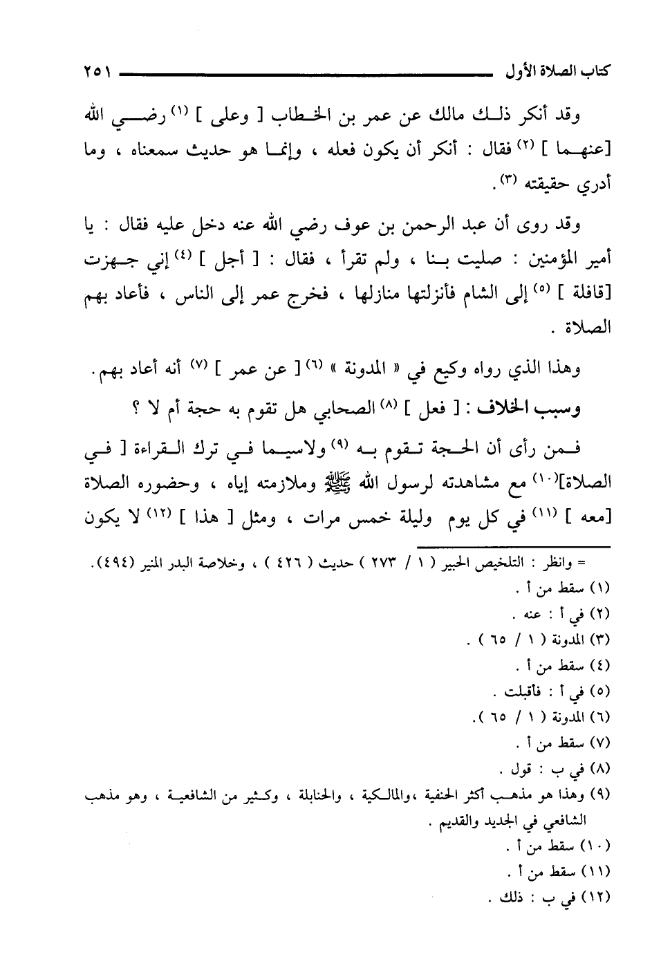 وقد روى أن عبد الرحمن بن عوف رضي الله عنه دخل عليه فقال: يا أمير المؤمنين: صليت بنا، ولم تقرأ، فقال: [أجل] (¬4) إني جهزت [قافلة] (¬5) إلى الشام فأنزلتها منازلها، فخرج عمر إلى الناس، فأعاد بهم الصلاة.