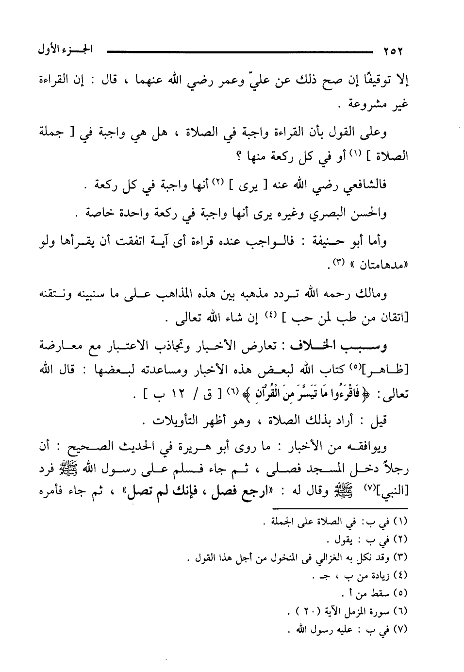 وسبب الخلاف: تعارض الأخبار وتجاذب الاعتبار مع معارضة [ظاهر] (¬5) كتاب الله لبعض هذه الأخبار ومساعدته لبعضها: قال الله تعالى: {فَاقْرَءُوا مَا تَيَسَّرَ مِنَ الْقُرْآنِ} (¬6) [ق/ 12 ب]. قيل: أراد بذلك الصلاة، وهو أظهر التأويلات.