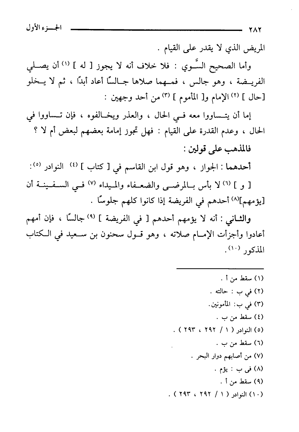 والثاني: أنه لا يؤمهم أحدهم [في الفريضة] (¬9) جالسًا، فإن أمهم أعادوا وأجزأت الإمام صلاته، وهو قول سحنون بن سعيد في الكتاب المذكور (¬10).