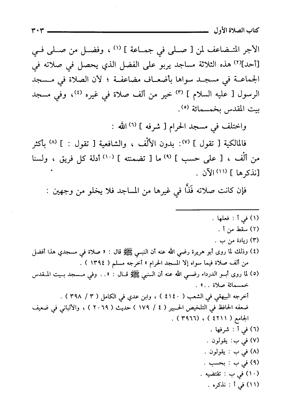 الأجر المتضاعف لمن [صلى في جماعة] (¬1)، وفضل من صلى في [أحد] (¬2) هذه الثلاثة مساجد يربو على الفضل الذي يحصل في صلاته في الجماعة في مسجد سواها بأضعاف مضاعفة؛ لأن الصلاة في مسجد الرسول [عليه السلام] (¬3) خير من ألف صلاة في غيره (¬4)، وفي مسجد بيت المقدس بخمسمائة (¬5).