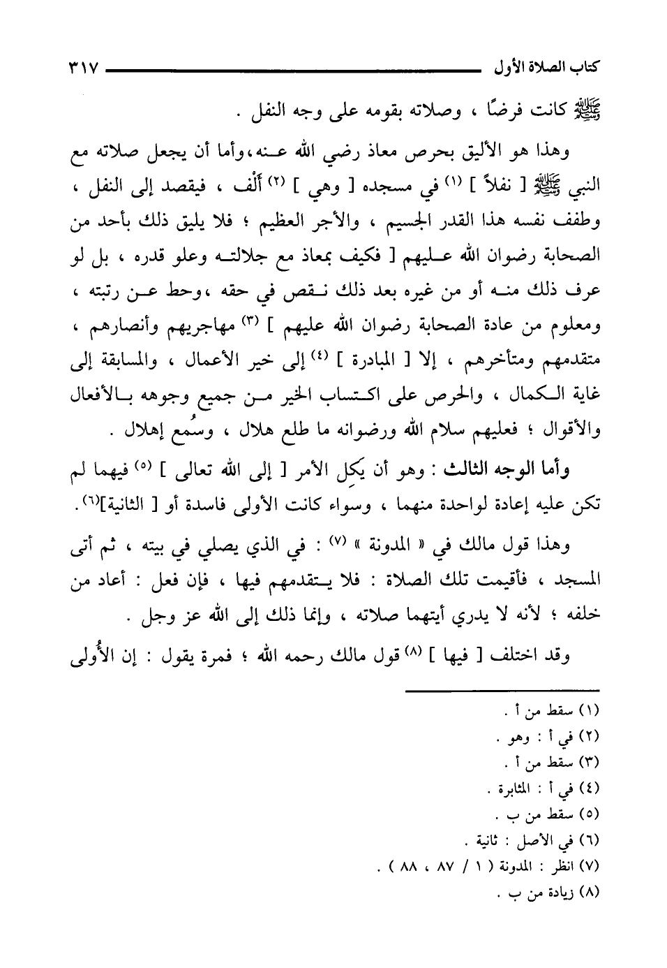 وهذا هو الأليق بحرص معاذ رضي الله عنه، وأما أن يجعل صلاته مع النبي - صلى الله عليه وسلم -[نفلًا] (¬1) في مسجده [وهي] (¬2) أَلْف، فيقصد إلى النفل، وطفف نفسه هذا القدر الجسيم، والأجر العظيم؛ فلا يليق ذلك بأحد من الصحابة رضوان الله عليهم [فكيف بمعاذ مع جلالته وعلو قدره، بل لو عرف ذلك منه أو من غيره بعد ذلك نقص في حقه، وحط عن رتبته، ومعلوم من عادة الصحابة رضوان الله عليهم] (¬3) مهاجريهم وأنصارهم، متقدمهم ومتأخرهم، إلا [المبادرة] (¬4) إلى خير الأعمال، والمسابقة إلى غاية الكمال، والحرص على اكتساب الخير من جميع وجوهه بالأفعال والأقوال؛ فعليهم سلام الله ورضوانه ما طلع هلال، وسُمع إهلال.