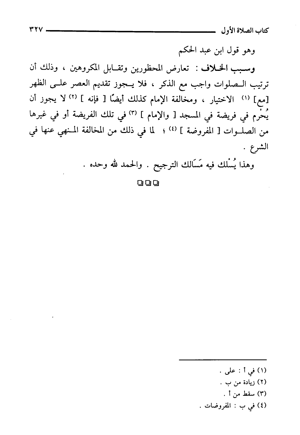 وسبب الخلاف: تعارض المحظورين وتقابل المكروهين، وذلك أن ترتيب الصلوات واجب مع الذكر، فلا يجوز تقديم العصر على الظهر [مع] (¬1) الاختيار، ومخالفة الإِمام كذلك أيضًا [فإنه] (¬2) لا يجوز أن يُحْرم في فريضة في المسجد [والإمام] (¬3) في تلك الفريضة أو في غيرها من الصلوات [المفروضة] (¬4)؛ لما في ذلك من المخالفة المنهي عنها في الشرع.