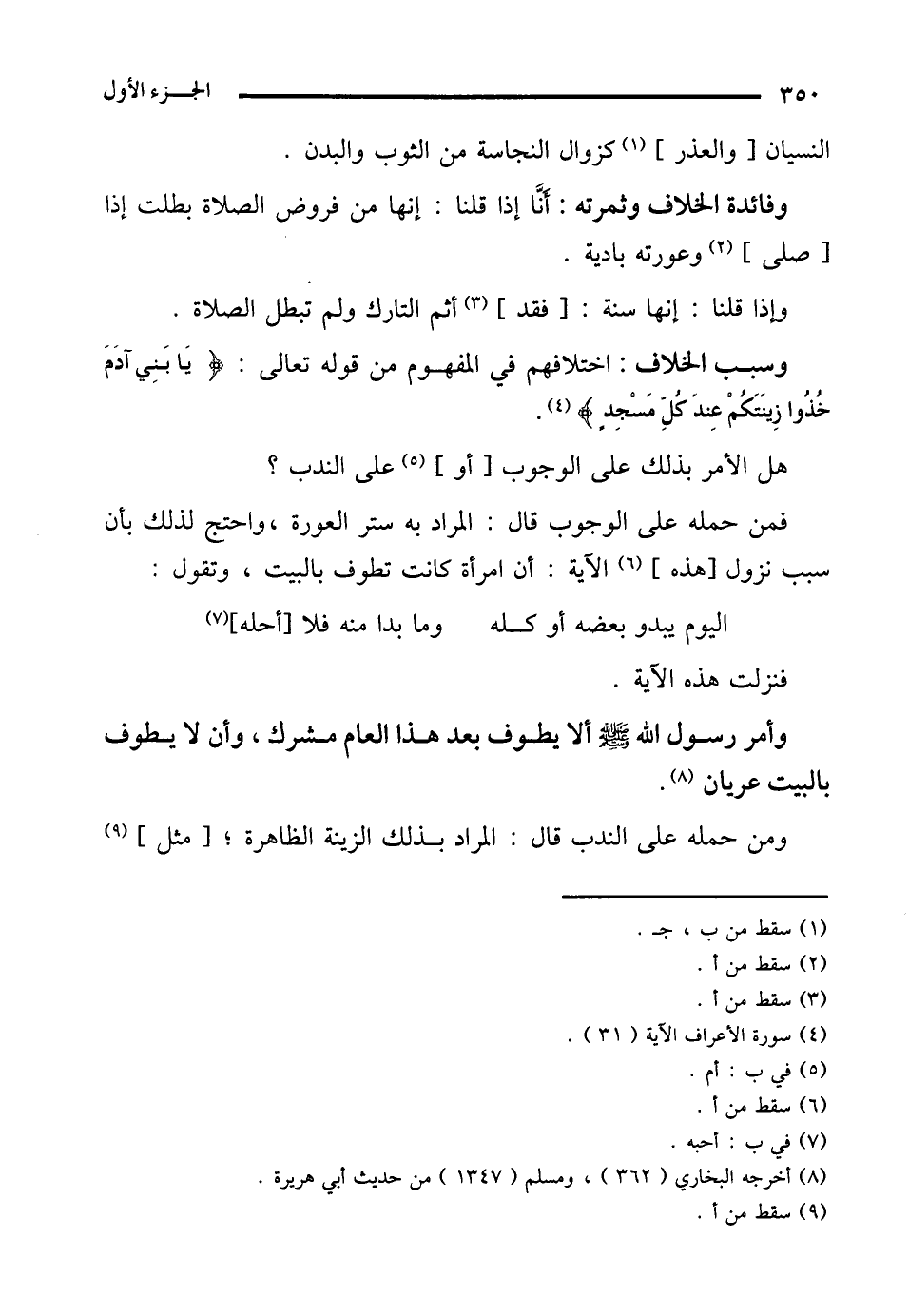 وسبب الخلاف: اختلافهم في المفهوم من قوله تعالى: {يَا بَنِي آدَمَ خُذُوا زِينَتَكُمْ عِندَ كُلِّ مَسْجِدٍ} (¬4).