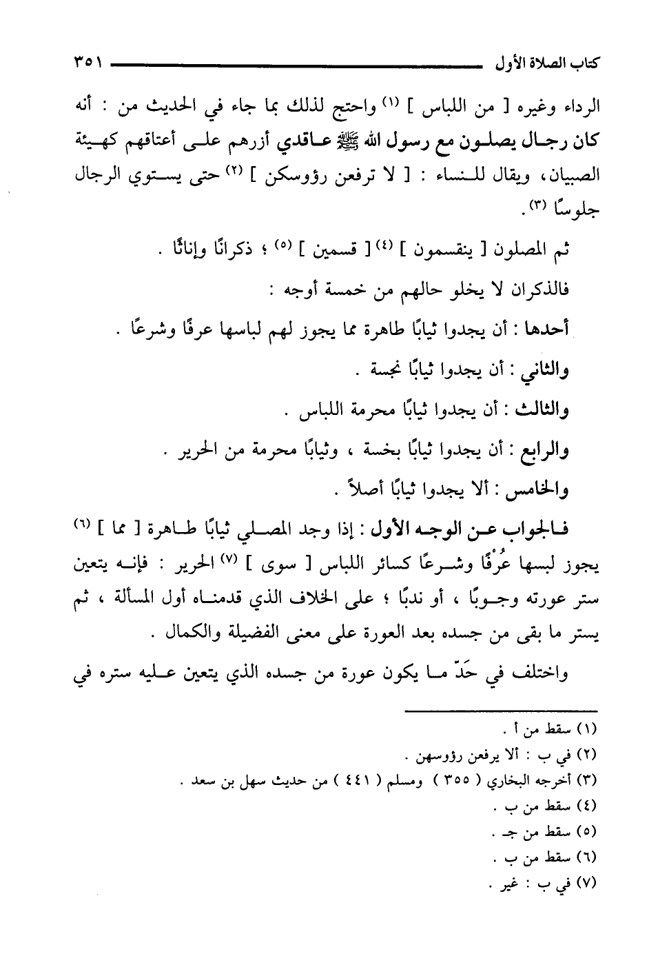 فالجواب عن الوجه الأول: إذا وجد المصلي ثيابًا طاهرة [مما] (¬6) يجوز لبسها عُرْفًا وشرعًا كسائر اللبالس [سوى] (¬7) الحرير: فإنه يتعين ستر عورته وجوبًا، أو ندبًا؛ على الخلاف الذي قدمناه أول المسألة، ثم يستر ما بقى من جسده بعد العورة على معنى الفضيلة والكمال.