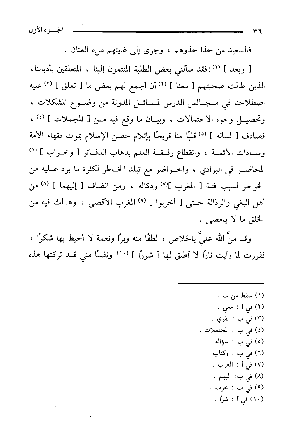 [وبعد] (¬1): فقد سألني بعض الطلبة المنتمون إلينا، المتعلقين بأذيالنا، الذين طالت صحبتهم [معنا] (¬2) أن أجمع لهم بعض ما [تعلق] (¬3) عليه اصطلاحنا في مجالس الدرس لمسائل المدونة من وضوح المشكلات، وتحصيل وجوه الاحتمالات، وبيان ما وقع فيه من [المجملات] (¬4) , فصادف [لسانه] (¬5) قلبًا منا قريحًا بائتلام حصن الإِسلام بموت فقهاء الأمة وسادات الأئمة، وانقطاع رفقة العلم بذهاب الدفاتر [وخراب] (¬6) المحاضر في البوادي والحواضر، مع تبلد الخاطر لكثرة ما يرد عليه من الخواطر لسبب فتنة [المغرب] (¬7) ودكاله، ومن انضاف [إليهما] (¬8) من أهل البغي والرذالة حتى [أخربوا] (¬9) المغرب الأقصى، وهلك فيه من الخلق ما لا يحصى.