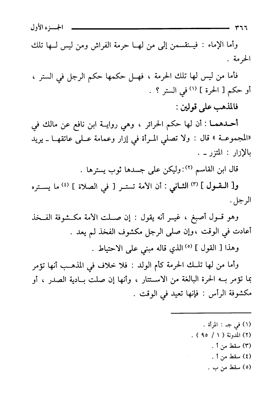 أحدهما: أن لها حكم الحرائر، وهي رواية ابن نافع عن مالك في "المجموعة" قال: ولا تصلي المرأة في إزار وعمامة على عاتقها -يريد بالإزار: المئزر-.