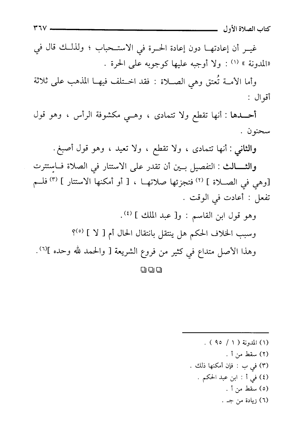 وأما الأمة تُعتق وهي الصلاة: فقد اختلف فيها المذهب على ثلاثة أقوال: