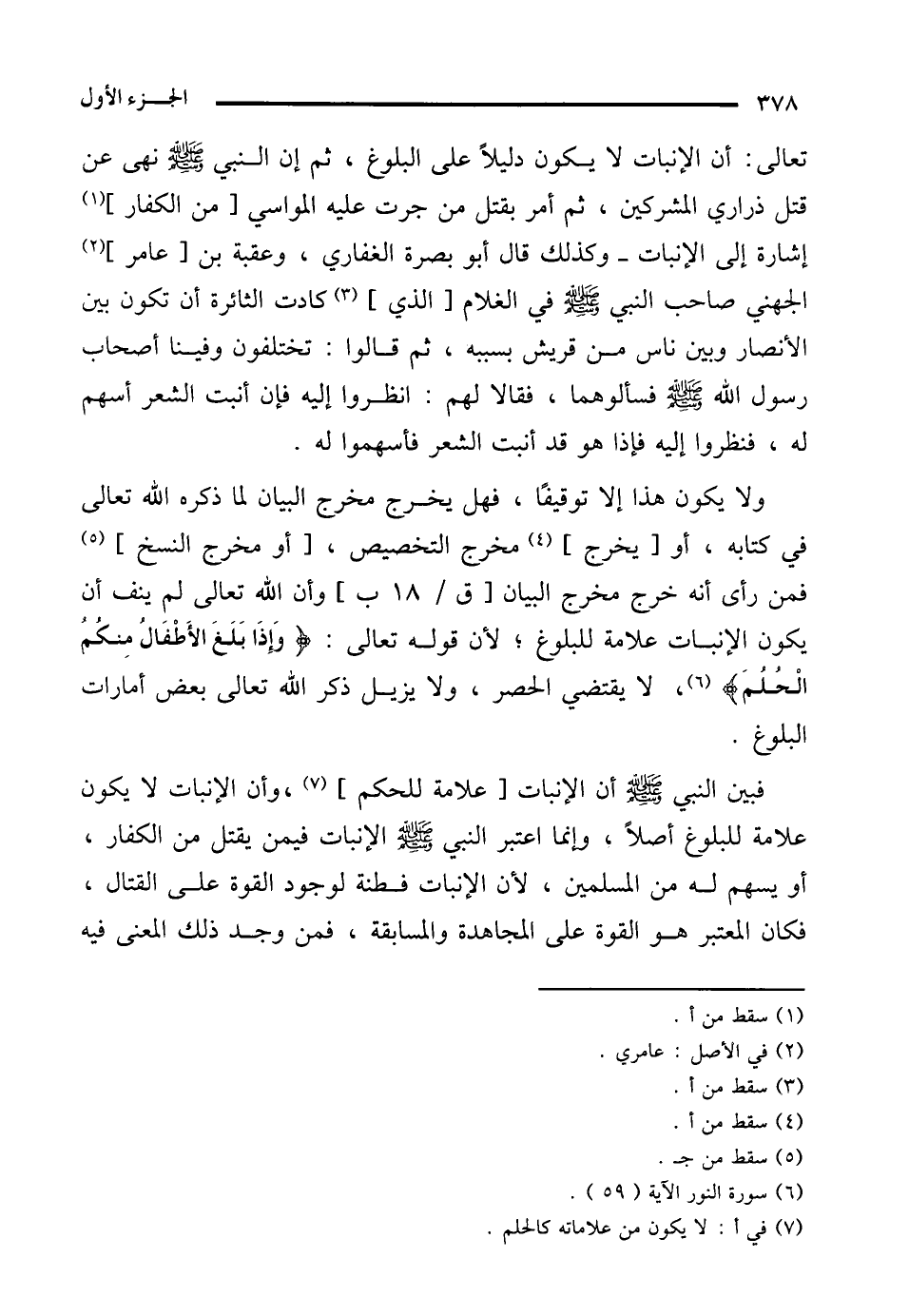 تعالى: أن الإنبات لا يكون دليلًا على البلوغ، ثم إن النبي - صلى الله عليه وسلم - نهى عن قتل ذراري المشركين، ثم أمر بقتل من جرت عليه المواسي [من الكفار] (¬1) إشارة إلى الإنبات -وكذلك قال أبو بصرة الغفاري، وعقبة بن [عامر] (¬2) الجهني صاحب النبي - صلى الله عليه وسلم - في الغلام [الذي] (¬3) كادت الثائرة أن تكون بين الأنصار وبين ناس من قريش بسببه، ثم قالوا: تختلفون وفينا أصحاب رسول الله - صلى الله عليه وسلم - فسألوهما، فقالا لهم: انظروا إليه فإن أنبت الشعر أسهم له، فنظروا إليه فإذا هو قد أنبت الشعر فأسهموا له.