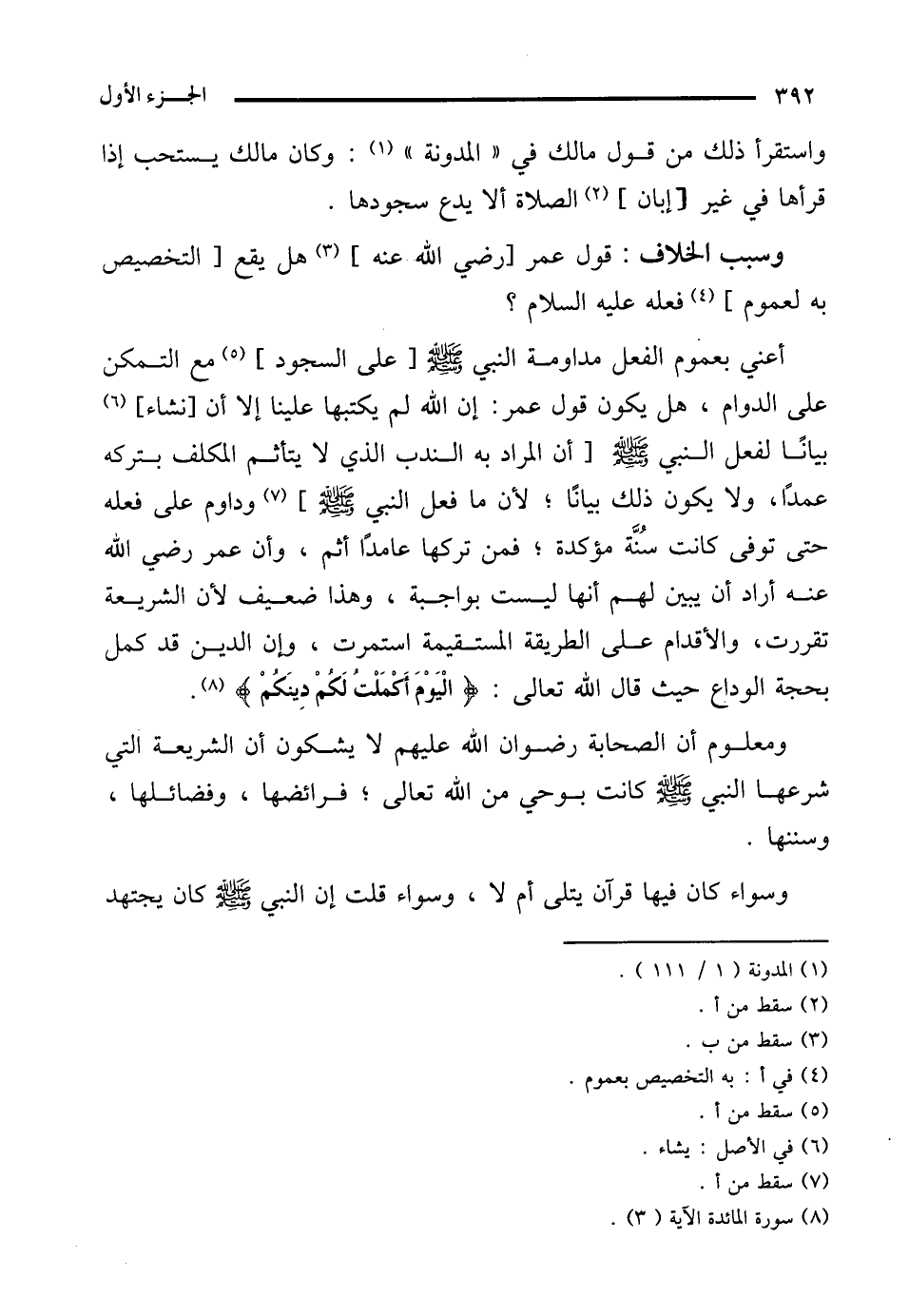 أعني بعموم الفعل مداومة النبي - صلى الله عليه وسلم -[على السجود] (¬5) مع التمكن على الدوام، هل يكون قول عمر: إن الله لم يكتبها علينا إلا أن [نشاء] (¬6) بيانًا لفعل النبي - صلى الله عليه وسلم -[أن المراد به الندب الذي لا يتأثم المكلف بتركه عمدًا، ولا يكون ذلك بيانًا؛ لأن ما فعل النبي - صلى الله عليه وسلم -] (¬7) وداوم على فعله حتى توفي كانت سُنَّة مؤكدة؛ فمن تركها عامدًا أثم، وأن عمر رضي الله عنه أراد أن يبين لهم أنها ليست بواجبة، وهذا ضعيف لأن الشريعة تقررت، والأقدام على الطريقة المستقيمة استمرت، وإن الدين قد كمل بحجة الوداع حيث قال الله تعالى: {الْيَوْمَ أَكْمَلْتُ لَكمْ دِينَكُمْ} (¬8).