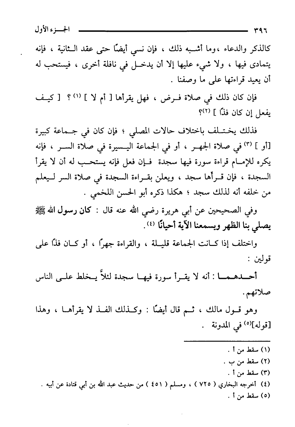 وهو قول مالك، ثم قال أيضًا: وكذلك الفذ لا يقرأها، وهذا [قوله] (¬5) في المدونة.