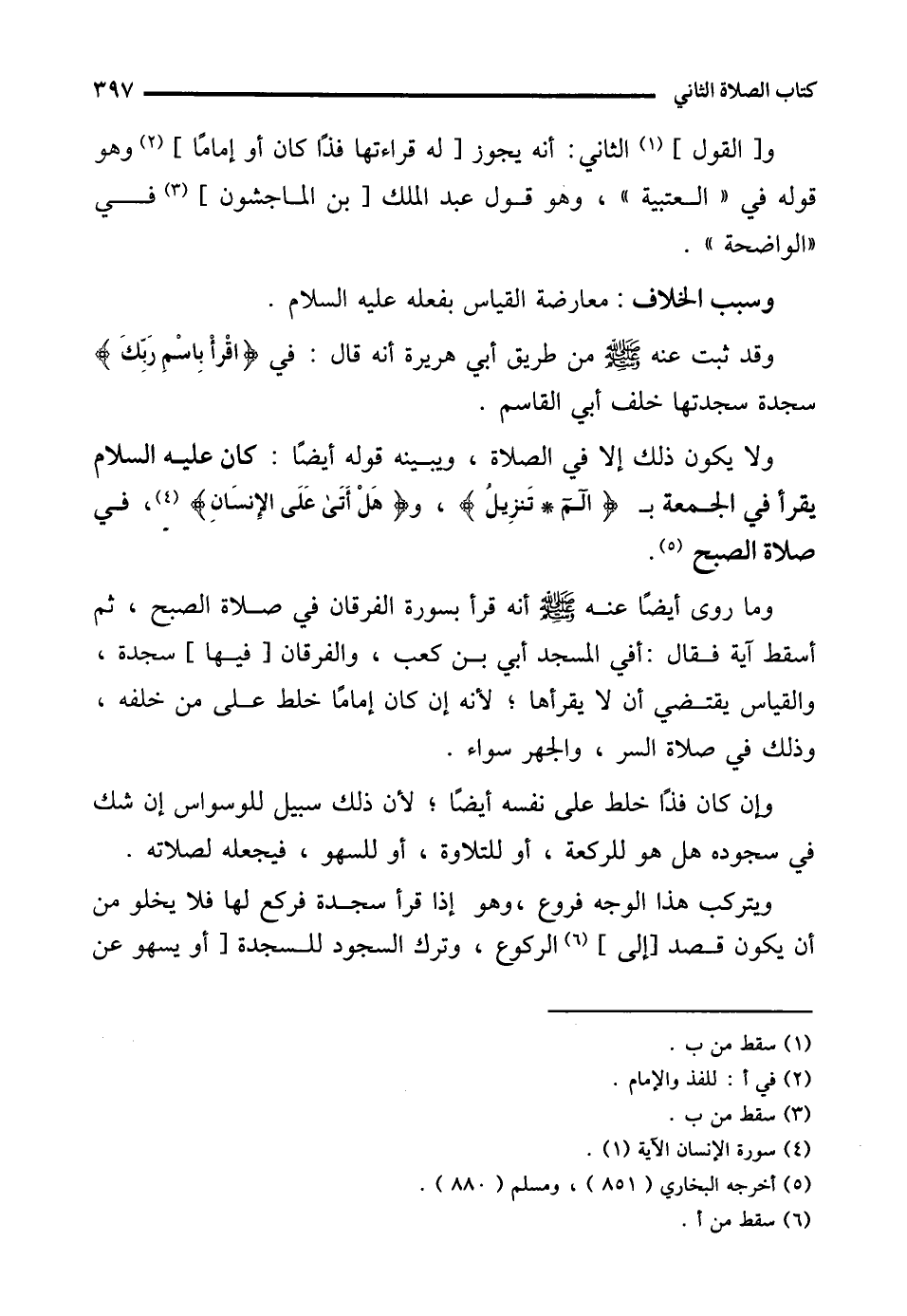 وما روى أيضًا عنه - صلى الله عليه وسلم - أنه قرأ بسورة الفرقان في صلاة الصبح، ثم أسقط آية فقال: أفي المسجد أبي بن كعب، والفرقان [فيها] سجدة، والقياس يقتضي أن لا يقرأها؛ لأنه إن كان إمامًا خلط على من خلفه، وذلك في صلاة السر، والجهر سواء.