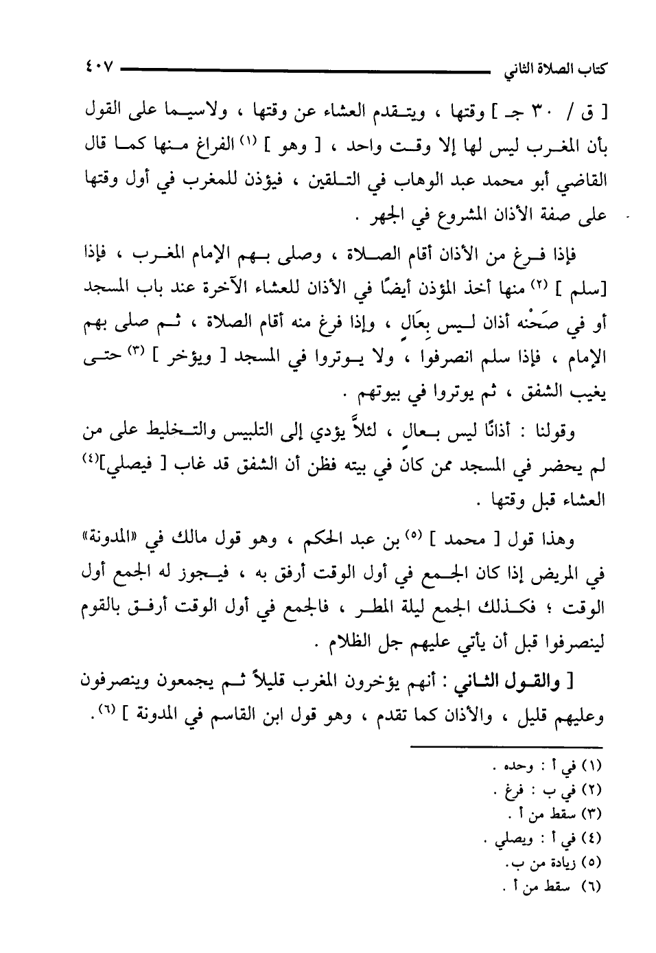 [والقول الثاني: أنهم يؤخرون المغرب قليلًا ثم يجمعون وينصرفون وعليهم قليل، والأذان كما تقدم، وهو قول ابن القاسم في المدونة] (¬6).