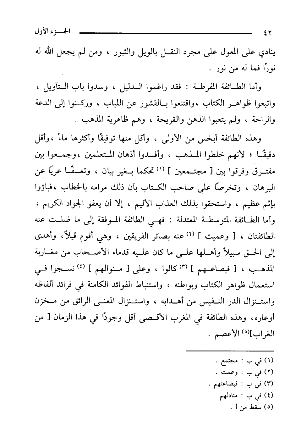 وهذه الطائفة أبخس من الأولى، وأقل منها توفيقًا وأكثرها ماءً، وأقل دقيقًا؛ لأنهم خلطوا المذهب، وأفسدوا أذهان المتعلمين، وجمعوا بين مفترق وفرقوا بين [مجتمعين] (¬1) تحكما بغير بيان، وتعسفًا عريًا عن البرهان، وتخرصًا على صاحب الكتاب بأن ذلك مرامه بالخطاب، فباؤوا بإثم عظيم، واستحقوا بذلك العذاب الأليم، إلا أن يعفو الجواد الكريم، وأما الطائفة المتوسطة المعتدلة: فهي الطائفة الموفقة إلى ما ضلت عنه الطائفتان، [وعميت] (¬2) عنه بصائر الفريقين، وهي أقوم قيلًا، وأهدى إلى الحق سبيلًا وأهلها على ما كان عليه قدماء الأصحاب من مغاربة المذهب، [فبصاعهم] (¬3) كالوا، وعلى [منوالهم] (¬4) نسجوا في استعمال ظواهر الكتاب وبواطنه، واستنباط الفوائد الكامنة في فرائد ألفاظه واستنزال الدر النفيس من أهدابه، واستنزال المعنى الرائق من مخزن أوعاره، وهذه الطائفة في المغرب الأقصى أقل وجودًا في هذا الزمان [من الغراب] (¬5) الأعصم.