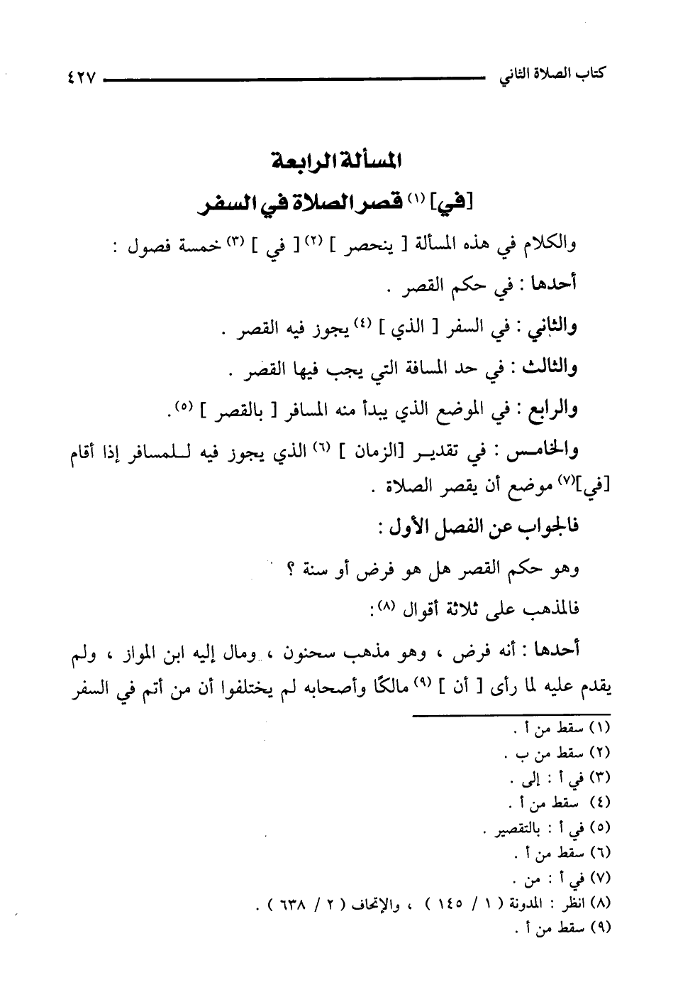 أحدها: أنه فرض، وهو مذهب سحنون، ومال إليه ابن المواز، ولم يقدم عليه لما رأى [أن] (¬9) مالكًا وأصحابه لم يختلفوا أن من أتم في السفر