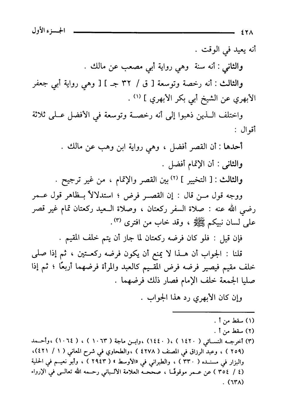 ووجه قول من قال: إن القصر فرض؛ استدلالًا بظاهر قول عمر رضي الله عنه: صلاة السفر ركعتان، وصلاة العيد ركعتان تمام غير قصر على لسان نبيكم - صلى الله عليه وسلم -، وقد خاب من افترى (¬3).