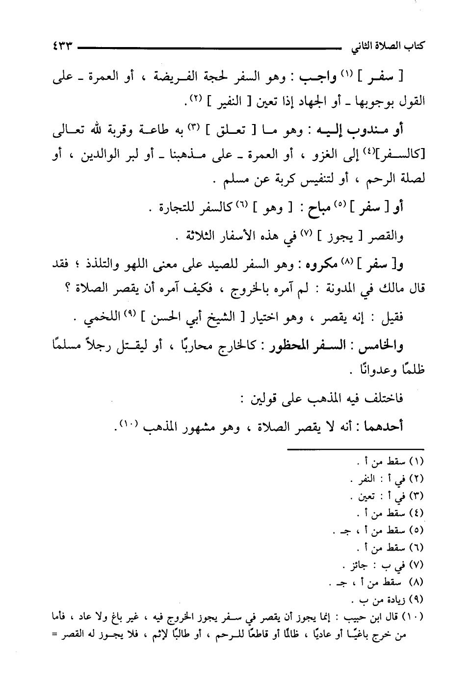 [سفر] (¬1) واجب: وهو السفر لحجة الفريضة، أو العمرة -على القول بوجوبها- أو الجهاد إذا تعين [النفير] (¬2).