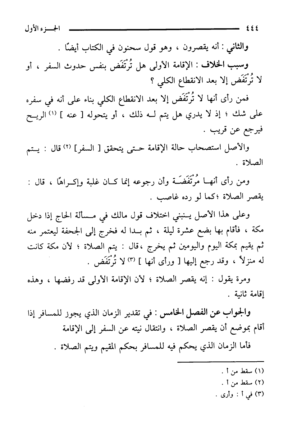 والجواب عن الفصل الخامس: في تقدير الزمان الذي يجوز للمسافر إذا أقام بموضع أن يقصر الصلاة، وانتقال نيته عن السفر إلى الإقامة فأما الزمان الذي يحكم فيه للمسافر بحكم المقيم ويتم الصلاة.