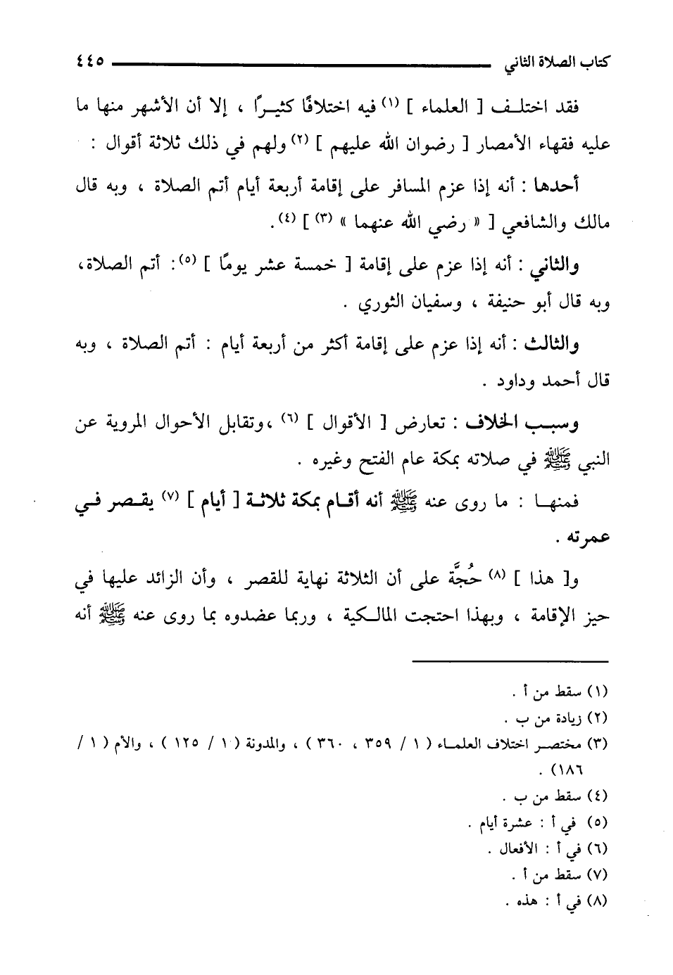 أحدها: أنه إذا عزم المسافر على إقامة أربعة أيام أتم الصلاة، وبه قال مالك والشافعي ["رضي الله عنهما" (¬3)] (¬4).