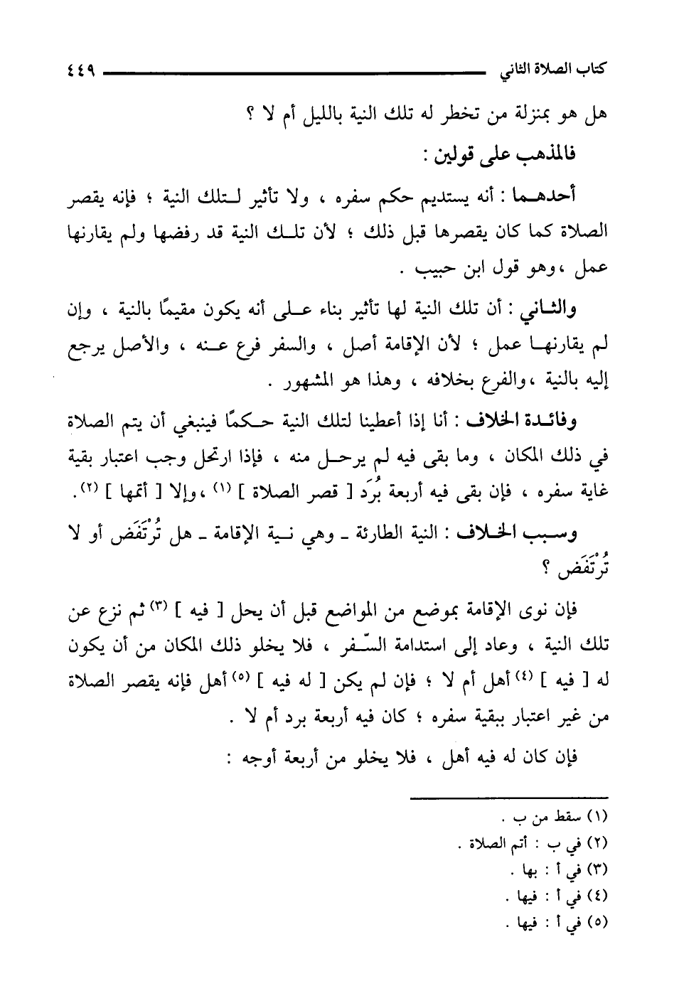 فإن نوى الإقامة بموضع من المواضع قبل أن يحل [فيه] (¬3) ثم نزع عن تلك النية، وعاد إلى استدامة السّفر، فلا يخلو ذلك المكان من أن يكون له [فيه] (¬4) أهل أم لا؛ فإن لم يكن [له فيه] (¬5) أهل فإنه يقصر الصلاة من غير اعتبار ببقية سفره؛ كان فيه أربعة برد أم لا.