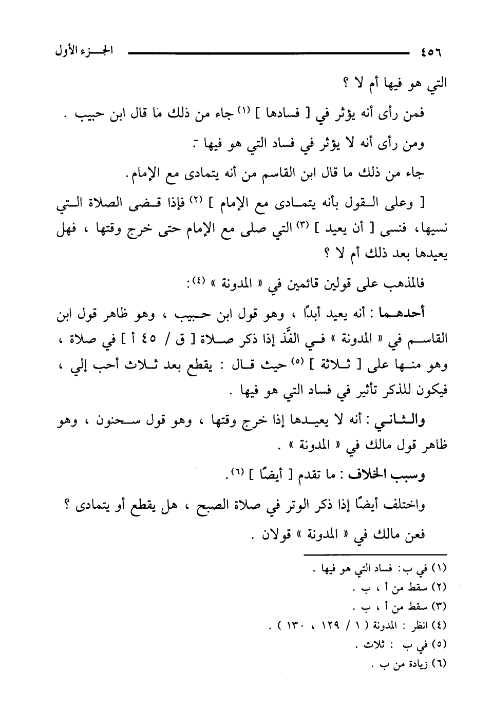 أحدهما: أنه يعيد أبدًا، وهو قول ابن حبيب، وهو ظاهر قول ابن القاسم في "المدونة" في الفَّذ إذا ذكر صلاة [ق/ 45 أ] في صلاة، وهو منها على [ثلاثة] (¬5) حيث قال: يقطع بعد ثلاث أحب إلى، فيكون للذكر تأثير في فساد التي هو فيها.