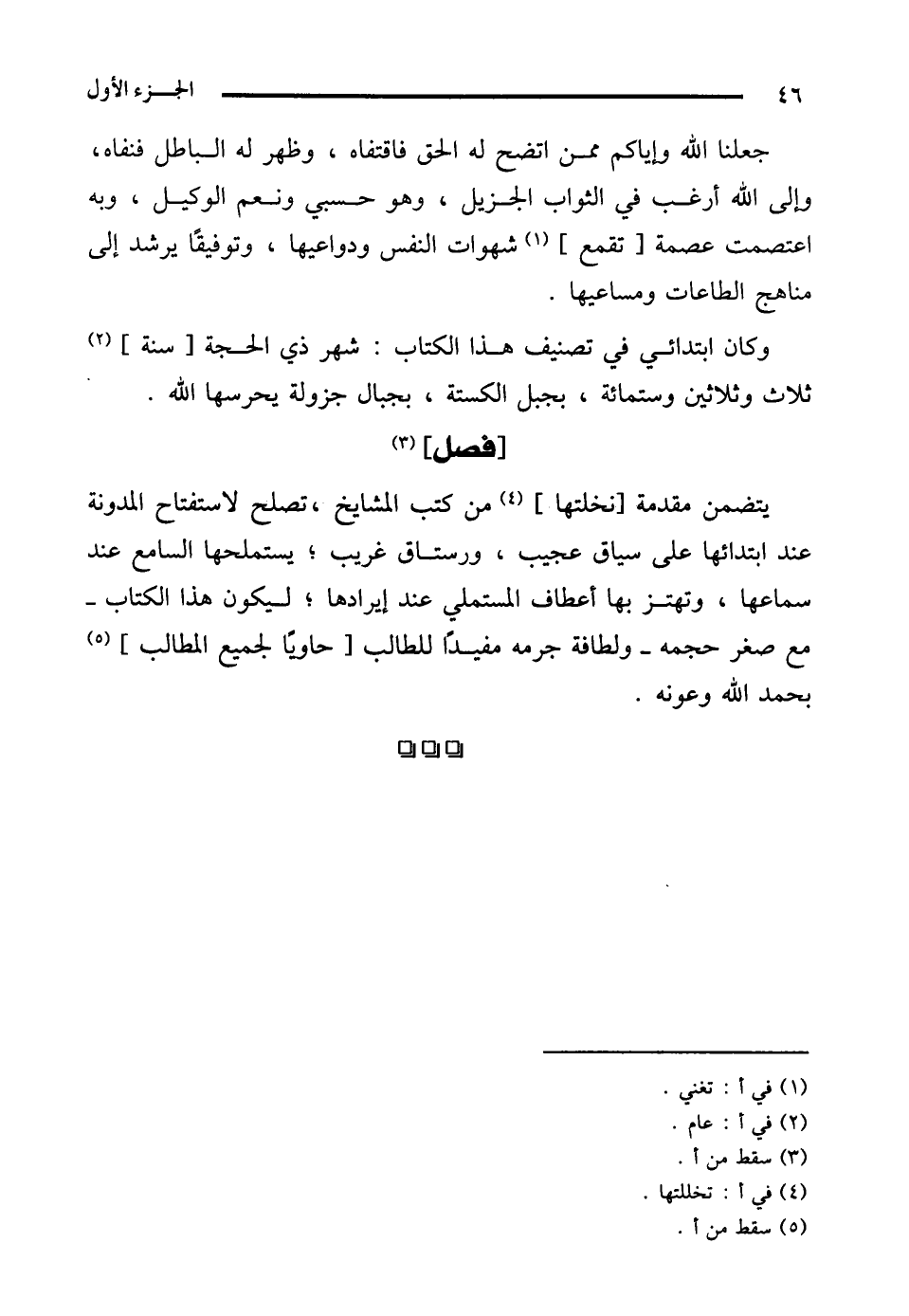 جعلنا الله وإياكم ممن اتضح له الحق فاقتفاه، وظهر له الباطل فنفاه، وإلى الله أرغب في الثواب الجزيل، وهو حسبي ونعم الوكيل، وبه اعتصمت عصمة [تقمع] (¬1) شهوات النفس ودواعيها، وتوفيقًا يرشد إلى مناهج الطاعات ومساعيها.