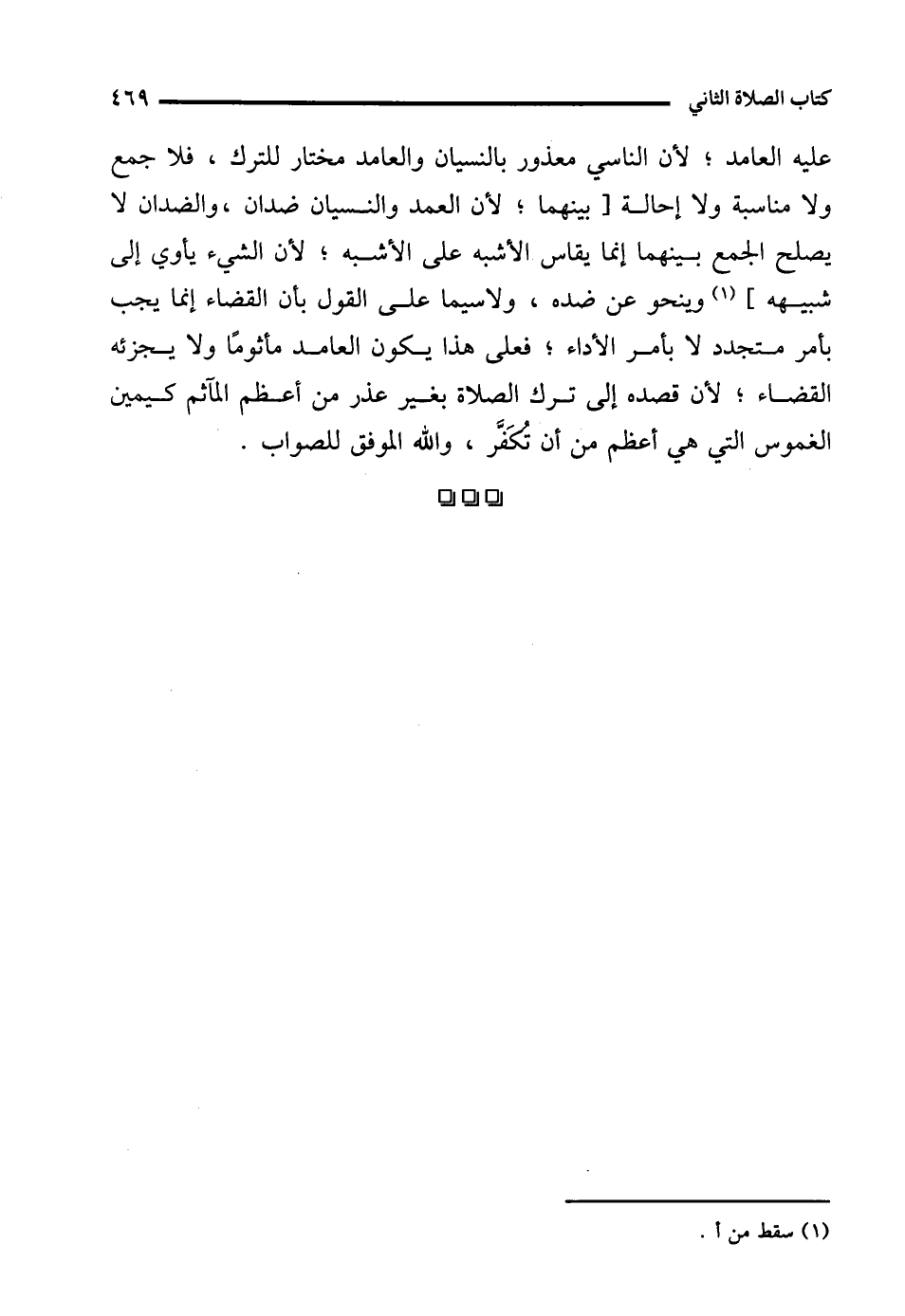 عليه العامد؛ لأن الناسي معذور بالنسيان والعامد مختار للترك، فلا جمع ولا مناسبة ولا إحالة [بينهما؛ لأن العمد والنسيان ضدان، والضدان لا يصلح الجمع بينهما إنما يقاس الأشبه على الأشبه؛ لأن الشيء يأوي إلى شبيهه] (¬1) وينحو عن ضده، ولاسيما على القول بأن القضاء إنما يجب بأمر متجدد لا بأمر الأداء؛ فعلى هذا يكون العامد مأثومًا ولا يجزئه القضاء؛ لأن قصده إلى ترك الصلاة بغير عذر من أعظم المآثم كيمين الغموس التي هي أعظم من أن تُكَفَّر، والله الموفق للصواب.