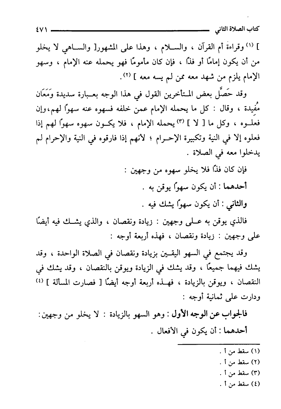 ] (¬1) وقراءة أم القرآن، والسلام، وهذا على المشهور [والساهي لا يخلو من أن يكون إمامًا أو فذًا، فإن كان مأمومًا فهو يحمله عنه الإمام، وسهو الإمام يلزم من شهد معه ممن لم يسه معه] (¬2).