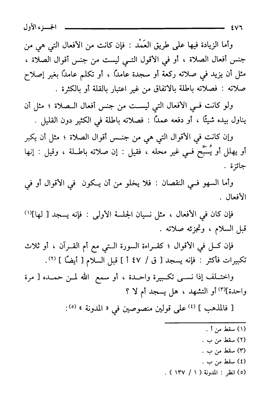 وأما الزيادة فيها على طريق العَمْد: فإن كانت من الأفعال التي هي من جنس أفعال الصلاة، أو في الأقوال التي ليست من جنس أقوال الصلاة، مثل أن يزيد في صلاته ركعة أو سجدة عامدًا، أو تكلم عامدًا بغير إصلاح صلاته: فصلاته باطلة بالاتفاق من غير اعتبار بالقلة أو بالكثرة.