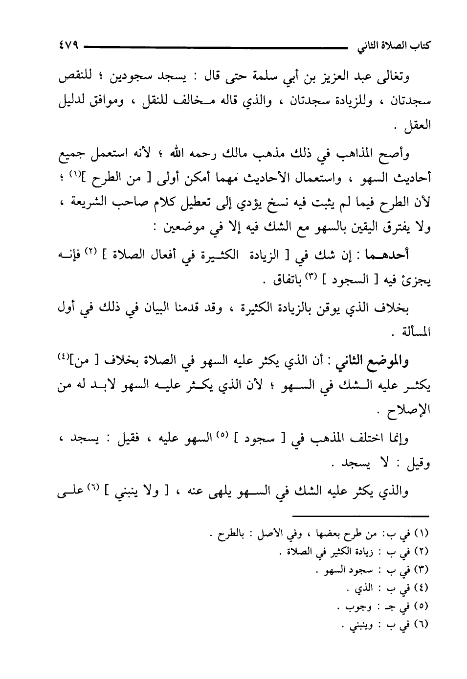 وتغالى عبد العزيز بن أبي سلمة حتى قال: يسجد سجودين؛ للنقص سجدتان، وللزيادة سجدتان، والذي قاله مخالف للنقل، وموافق لدليل العقل.