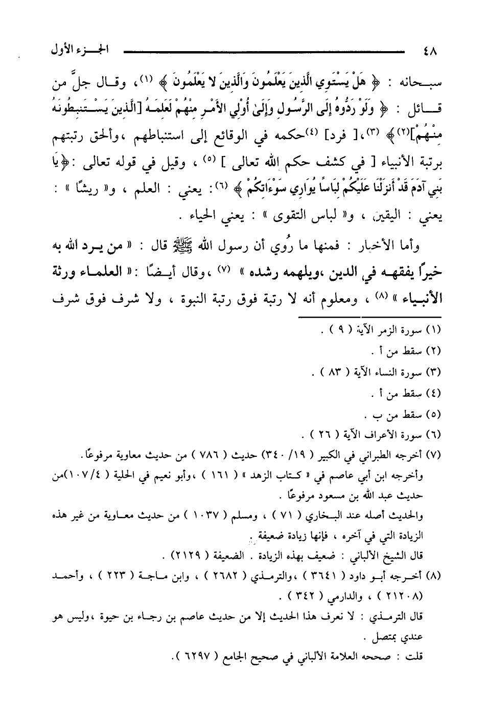 سبحانه: {هَلْ يَسْتَوِي الَّذِينَ يَعْلَمُونَ وَالَّذِينَ لَا يَعْلَمُونَ} (¬1)، وقال جلَّ من قائل: {وَلَوْ رَدُّوهُ إِلَى الرَّسُولِ وَإِلَى أُولِي الْأَمْرِ مِنْهُمْ لَعَلِمَهُ [الَّذِينَ يَسْتَنْبِطُونَهُ مِنْهُمْ] (¬2)} (¬3)، [فرد] (¬4) حكمه في الوقائع إلى استنباطهم، وألحق رتبتهم برتبة الأنبياء [في كشف حكم الله تعالى] (¬5)، وقيل في قوله تعالى: {يَا بَنِي آدَمَ قَدْ أَنْزَلْنَا عَلَيْكُمْ لِبَاسًا يُوَارِي سَوْآتِكُمْ} (¬6): يعني: العلم، و"ريشًا": يعني: اليقين، و"لباس التقوى": يعني الحياء.