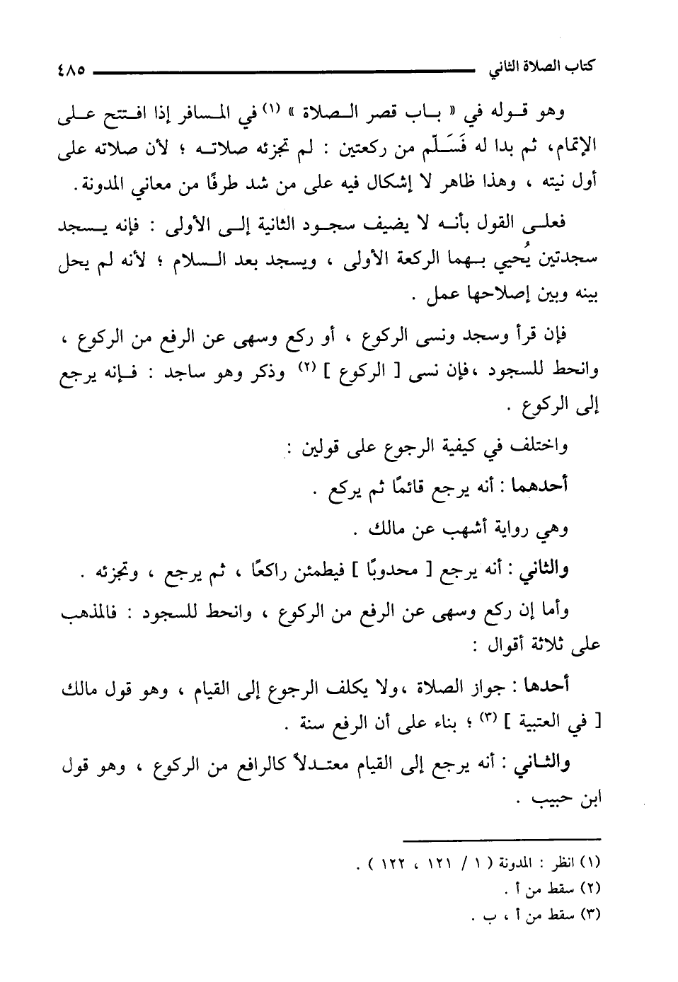 وهو قوله في "باب قصر الصلاة" (¬1) في المسافر إذا افتتح على الإتمام، ثم بدا له فَسَلّم من ركعتين: لم تجزئه صلاته؛ لأن صلاته على أول نيته، وهذا ظاهر لا إشكال فيه على من شد طرفًا من معاني المدونة.
