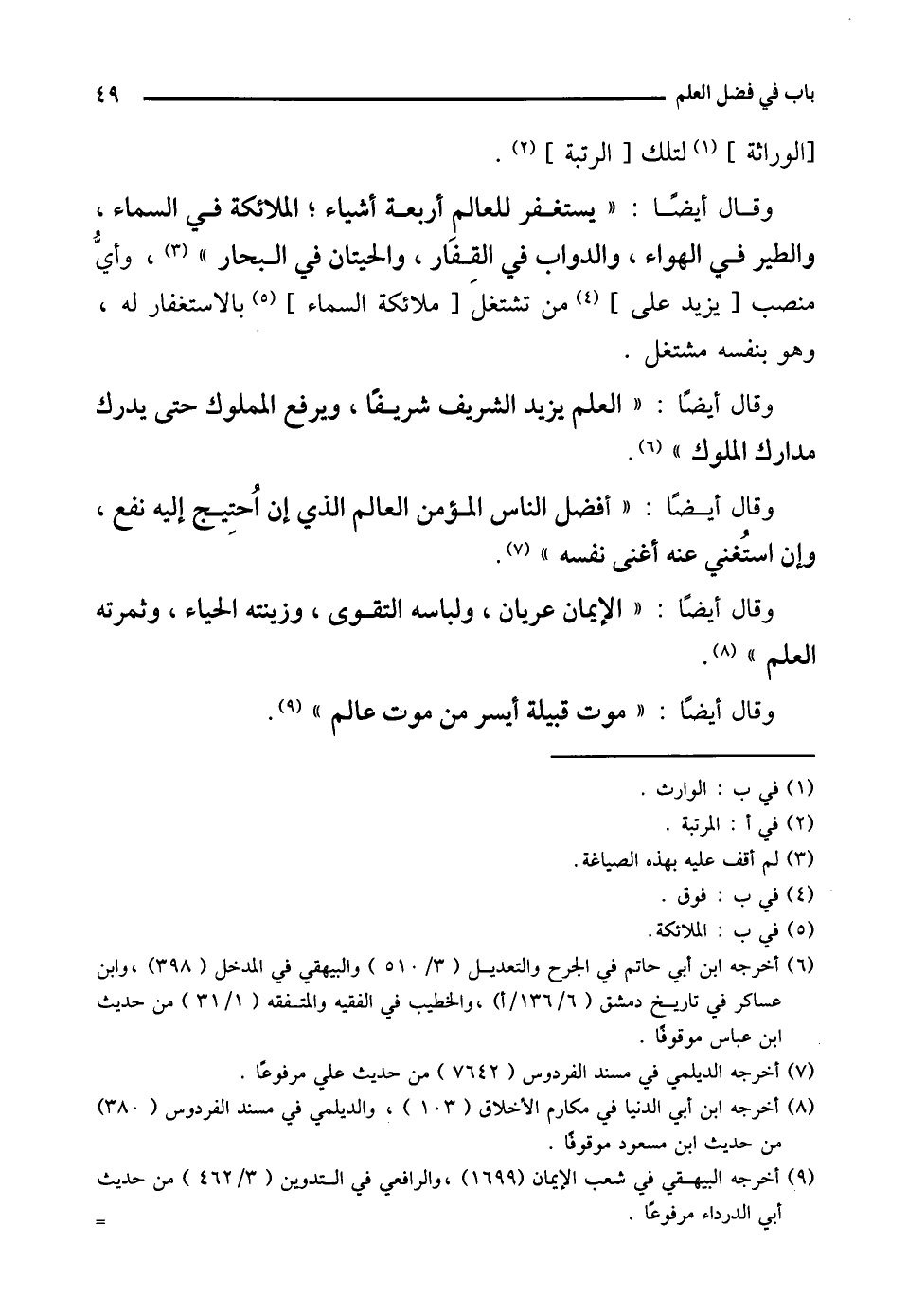 (¬9) أخرجه البيهقي في شعب الإيمان (1699)، والرافعي في التدوين (3/ 462) من حديث أبي الدرداء مرفوعًا. =