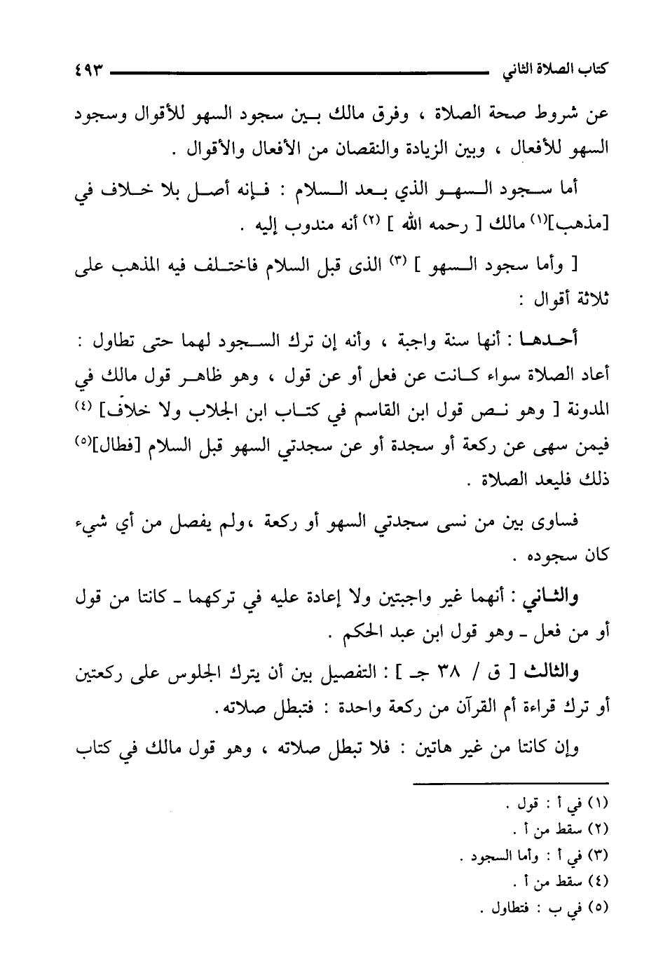 عن شروط صحة الصلاة، وفرق مالك بين سجود السهو للأقوال وسجود السهو للأفعال، وبين الزيادة والنقصان من الأفعال والأقوال.
