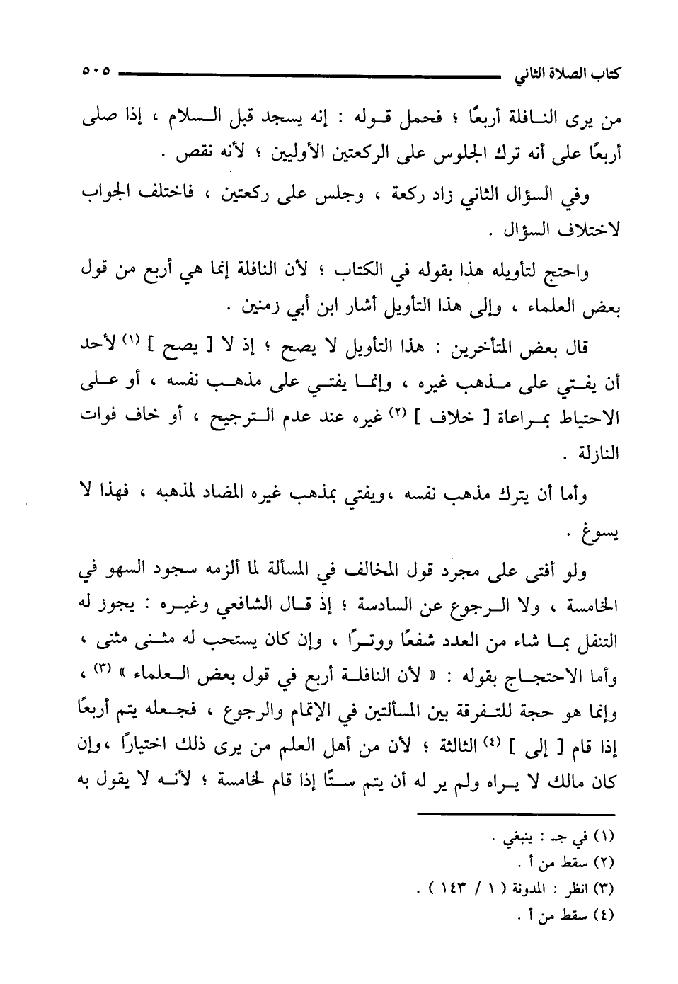 ولو أفتى على مجرد قول المخالف في المسألة لما ألزمه سجود السهو في الخامسة، ولا الرجوع عن السادسة؛ إذ قال الشافعي وغيره: يجوز له التنفل بما شاء من العدد شفعًا ووترًا، وإن كان يستحب له مثنى مثنى، وأما الاحتجاج بقوله: "لأن النافلة أربع في قول بعض العلماء" (¬3)، وإنما هو حجة للتفرقة بين المسألتين في الإتمام والرجوع، فجعله يتم أربعًا إذا قام [إلى] (¬4) الثالثة؛ لأن من أهل العلم من يرى ذلك اختيارًا، وإن كان مالك لا يراه ولم ير له أن يتم ستًا إذا قام لخامسة؛ لأنه لا يقول به