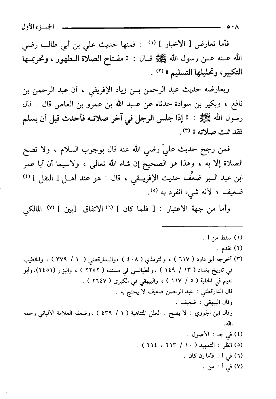 فمن رجح حديث علي رضي الله عنه قال بوجوب السلام، ولا تصح الصلاة إلا به، وهذا هو الصحيح إن شاء الله تعالى، ولاسيما أن أبا عمر ابن عبد البر ضعَّف حديث الإفريقي، قال: هو عند أهل [النقل] (¬4) ضعيف؛ لأنه شيء انفرد به (¬5).