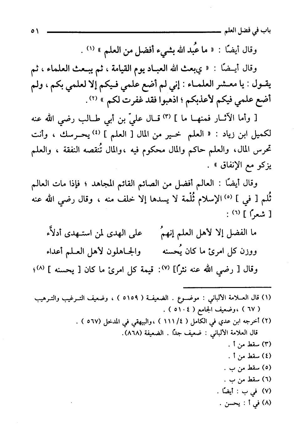 وقال أيضًا: العالم أفضل من الصائم القائم المجاهد؛ فإذا مات العالم ثُلم [في] (¬5) الإسلام ثُلْمة لا يسدها إلا خلف منه، وقال رضي الله عنه [شعرًا] (¬6):
