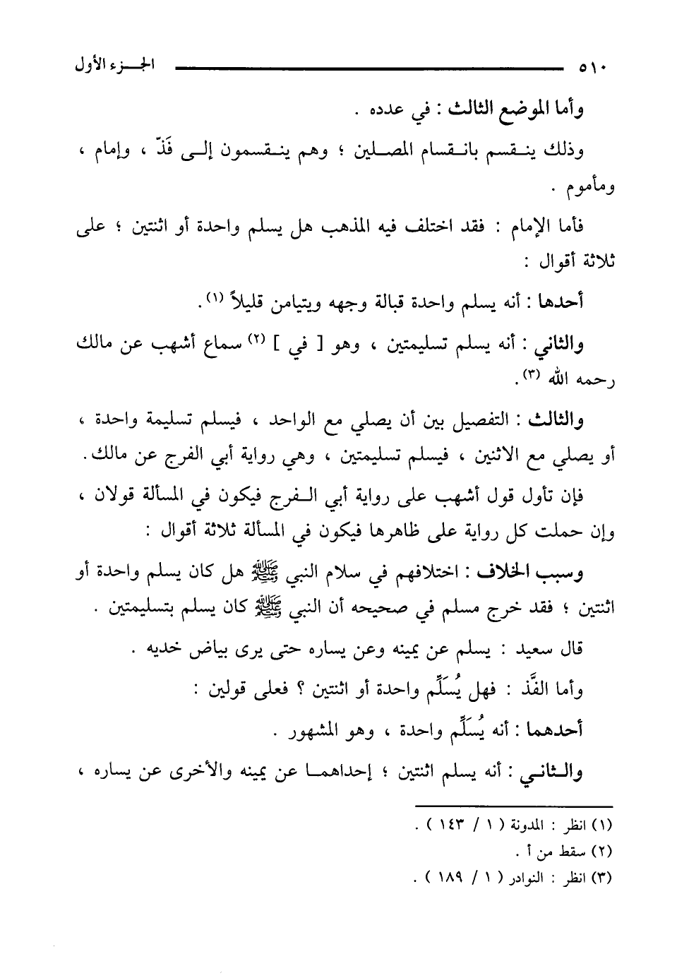فأما الإمام: فقد اختلف فيه المذهب هل يسلم واحدة أو اثنتين؛ على ثلاثة أقوال: