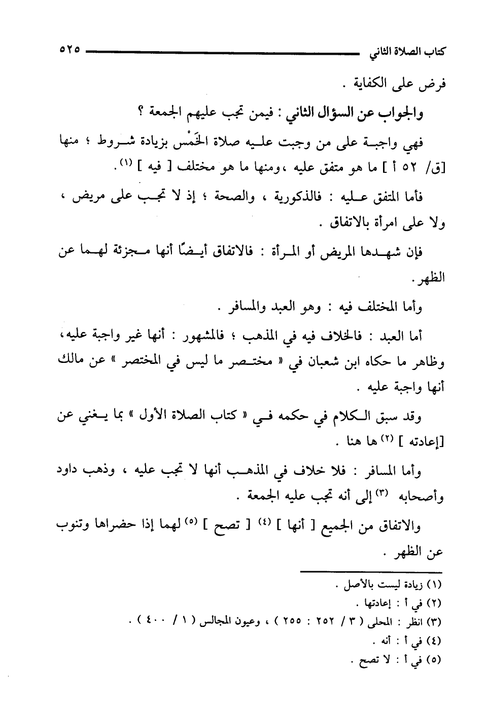 فهي واجبة على من وجبت عليه صلاة الخَمْس بزيادة شروط؛ منها [ق/ 52 أ] ما هو متفق عليه، ومنها ما هو مختلف [فيه] (¬1).