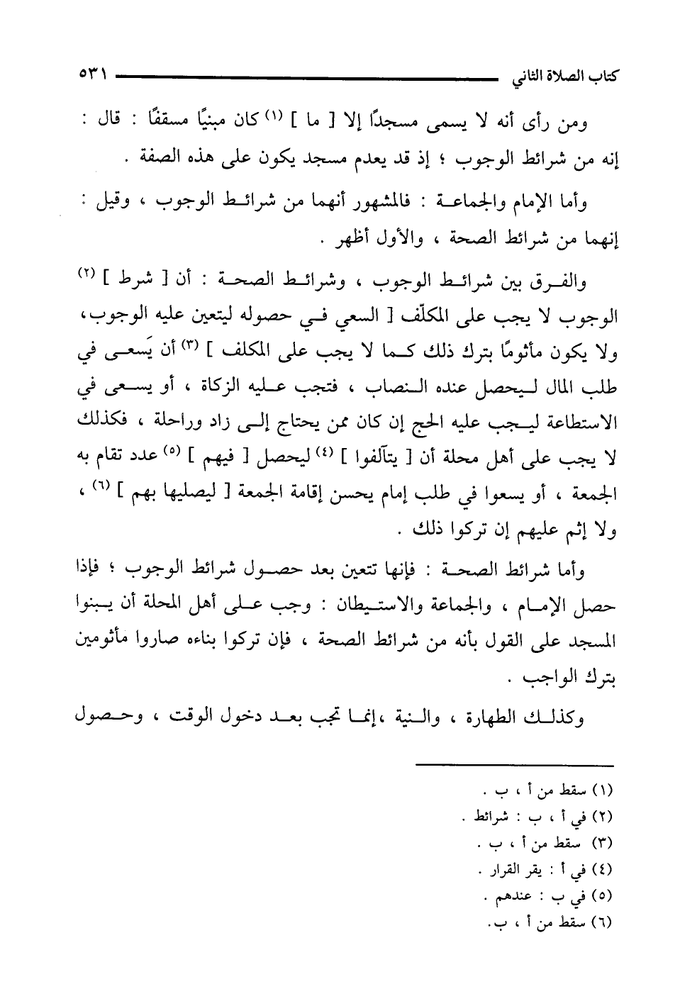 والفرق بين شرائط الوجوب، وشرائط الصحة: أن [شرط] (¬2) الوجوب لا يجب على المكلّف [السعي في حصوله ليتعين عليه الوجوب، ولا يكون مأثومًا بترك ذلك كما لا يجب على المكلف] (¬3) أن يَسعى في طلب المال ليحصل عنده النصاب، فتجب عليه الزكاة، أو يسعى في الاستطاعة ليجب عليه الحج إن كان ممن يحتاج إلى زاد وراحلة، فكذلك لا يجب على أهل محلة أن [يتآلفوا] (¬4) ليحصل [فيهم] (¬5) عدد تقام به الجمعة، أو يسعوا في طلب إمام يحسن إقامة الجمعة [ليصليها بهم] (¬6)، ولا إثم عليهم إن تركوا ذلك.