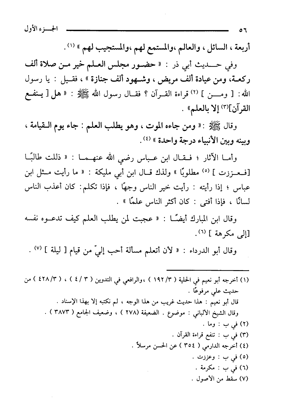 وفي حديث أبي ذر: "حضور مجلس العلم خير من صلاة ألف ركعة، ومن عيادة ألف مريض، وشهود ألف جنازة"، فقيل: يا رسول الله: [ومن] (¬2) قراءه القرآن؟ فقال رسول الله - صلى الله عليه وسلم -: "هل [ينفع القرآن] (¬3) إلا بالعلم".