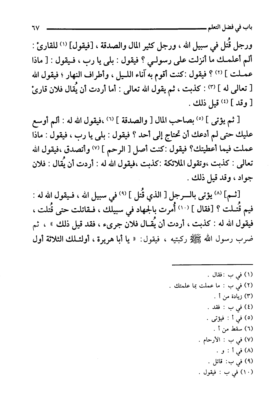 ورجل قُتل في سبيل الله، ورجل كثير المال والصدقة، [فيقول] (¬1) للقارئ: ألم أعلمك ما أنزلت على رسولي؟ فيقول: بلى يا رب، فيقول: [ماذا عملت] (¬2)؟ فيقول: كنت أقوم به آناء الليل، وأطراف النهار؛ فيقول الله [تعالى له] (¬3): كذبت، ثم يقول الله تعالى: أما أردت أن يُقال فلان قارئ [وقد] (¬4) قيل ذلك.