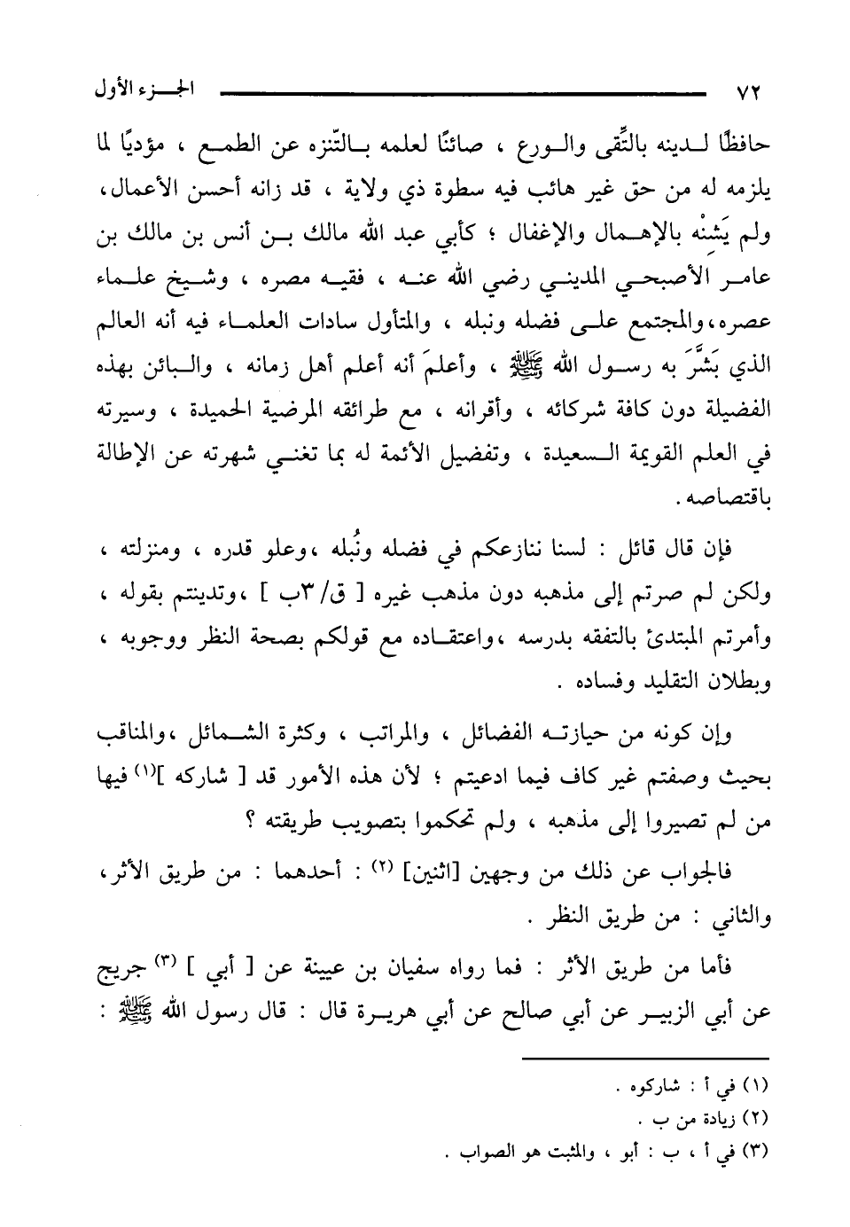 حافظًا لدينه بالتِّقى والورع، صائنًا لعلمه بالتّنزه عن الطمع، مؤديًا لما يلزمه له من حق غير هائب فيه سطوة ذي ولاية، قد زانه أحسن الأعمال، ولم يَشِنْه بالإهمال والإغفال؛ كأبي عبد الله مالك بن أنس بن مالك بن عامر الأصبحي المديني رضي الله عنه، فقيه مصره، وشيخ علماء عصره، والمجتمع على فضله ونبله، والمتأول سادات العلماء فيه أنه العالم الذي بَشَّرَ به رسول الله - صلى الله عليه وسلم -، وأعلمَ أنه أعلم أهل زمانه، والبائن بهذه الفضيلة دون كافة شركائه، وأقرانه، مع طرائقه المرضية الحميدة، وسيرته في العلم القويمة السعيدة، وتفضيل الأئمة له بما تغني شهرته عن الإطالة باقتصاصه.