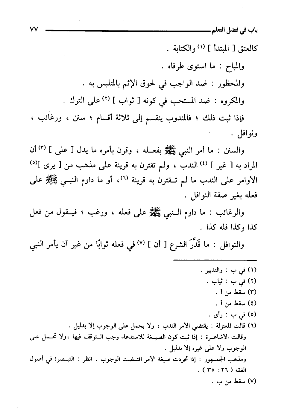 والسنن: ما أمر النبي - صلى الله عليه وسلم - بفعله، وقرن بأمره ما يدل [على] (¬3) أن المراد به [غير] (¬4) الندب، ولم تقترن به قرينة على مذهب من [يرى] (¬5) الأوامر على الندب ما لم تقترن به قرينة (¬6)، أو ما داوم النبي - صلى الله عليه وسلم - على فعله بغير صفة النوافل.