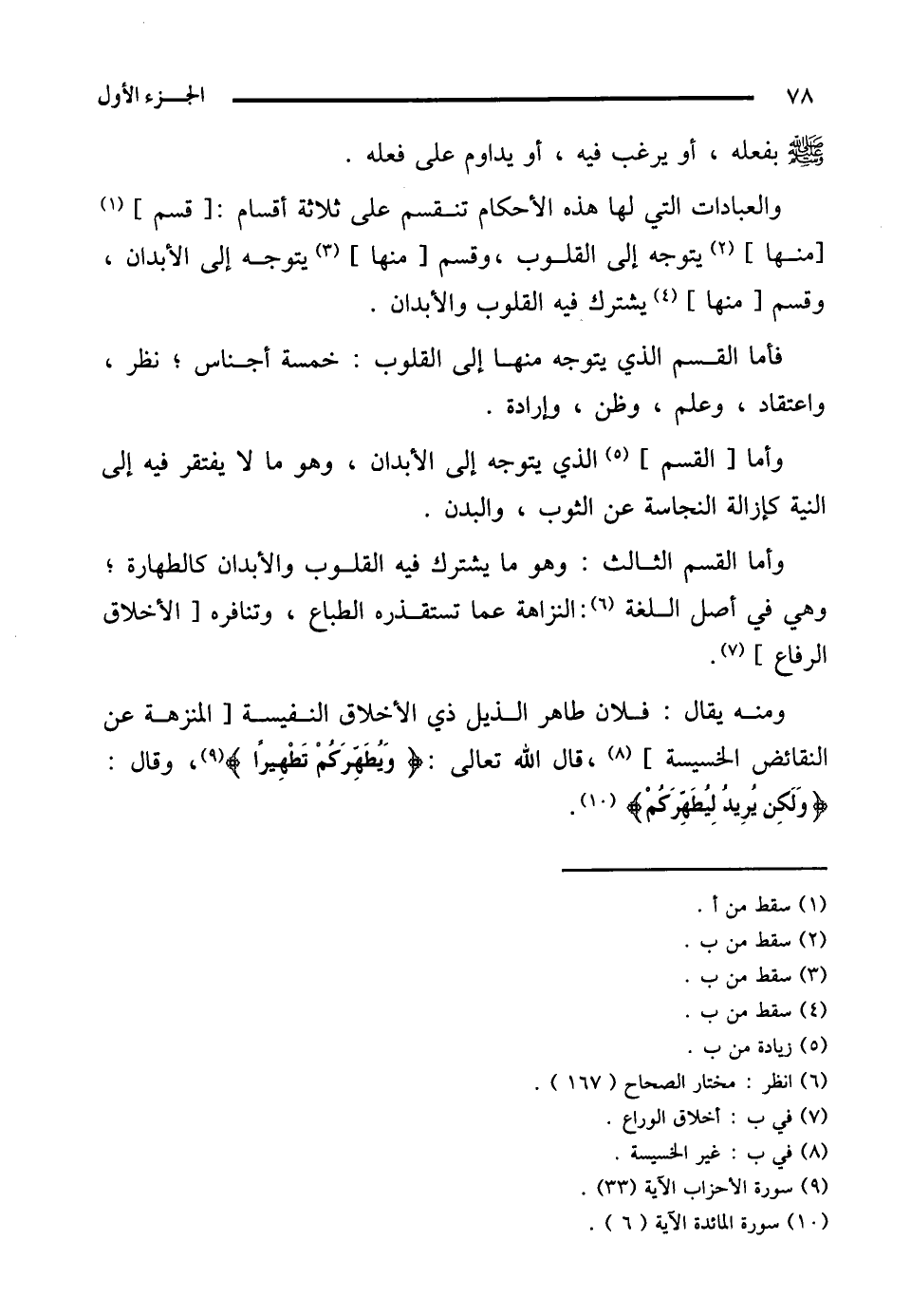 ومنه يقال: فلان طاهر الذيل ذي الأخلاق النفيسة [المنزهة عن النقائض الخسيسة] (¬8)، قال الله تعالى: {وَيُطَهِّرَكُمْ تَطْهِيرًا} (¬9)، وقال: {وَلَكِنْ يُرِيدُ لِيُطَهِّرَكُمْ} (¬10).