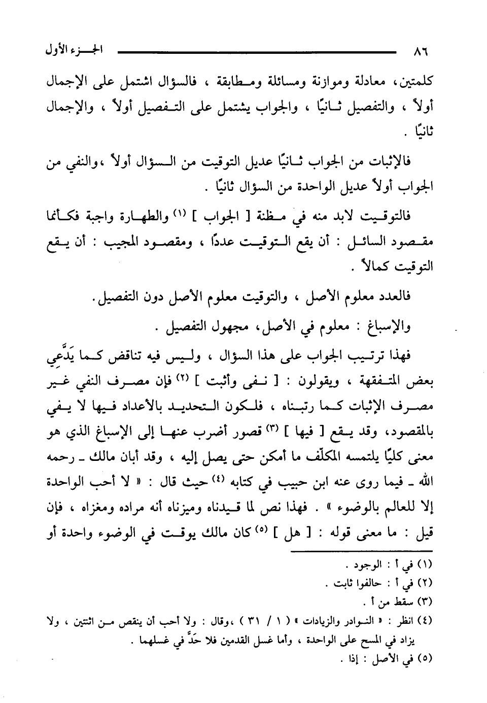فهذا ترتيب الجواب على هذا السؤال، وليس فيه تناقض كما يَدَّعِي بعض المتفقهة، ويقولون: [نفى وأثبت] (¬2) فإن مصرف النفي غير مصرف الإثبات كما رتبناه، فلكون التحديد بالأعداد فيها لا يفي بالمقصود، وقد يقع [فيها] (¬3) قصور أضرب عنها إلى الإسباغ الذي هو معنى كليًا يلتمسه المكلّف ما أمكن حتى يصل إليه، وقد أبان مالك -رحمه الله- فيما روى عنه ابن حبيب في كتابه (¬4) حيث قال: "لا أحب الواحدة إلا للعالم بالوضوء". فهذا نص لما قيدناه وميزناه أنه مراده ومغزاه، فإن قيل: ما معنى قوله: [هل] (¬5) كان مالك يوقت في الوضوء واحدة أو