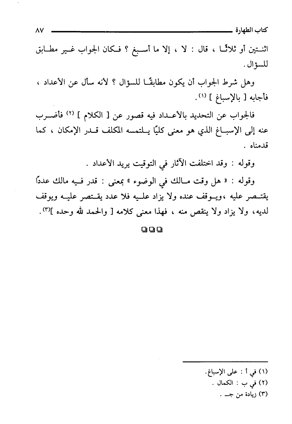 فالجواب عن التحديد بالأعداد فيه قصور عن [الكلام] (¬2) فأضرب عنه إلى الإسباغ الذي هو معنى كليًا يلتمسه المكلف قدر الإمكان، كما قدمناه.