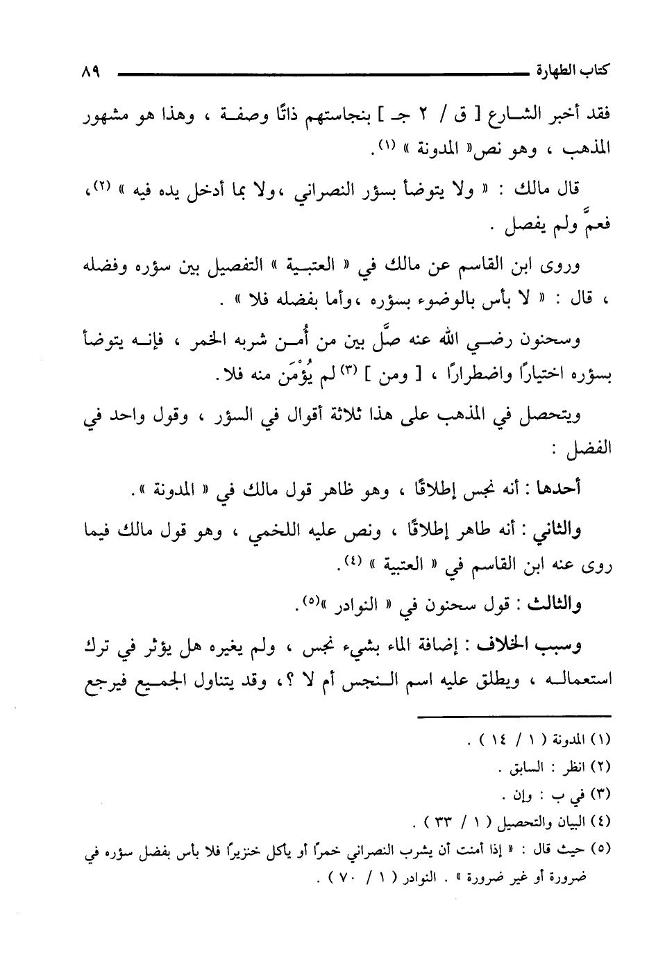 (¬5) حيث قال: "إذا أمنت أن يشرب النصراني خمرًا أو يأكل خنزيرًا فلا بأس بفضل سؤره في ضرورة أو غير ضرورة". النوادر (1/ 70).