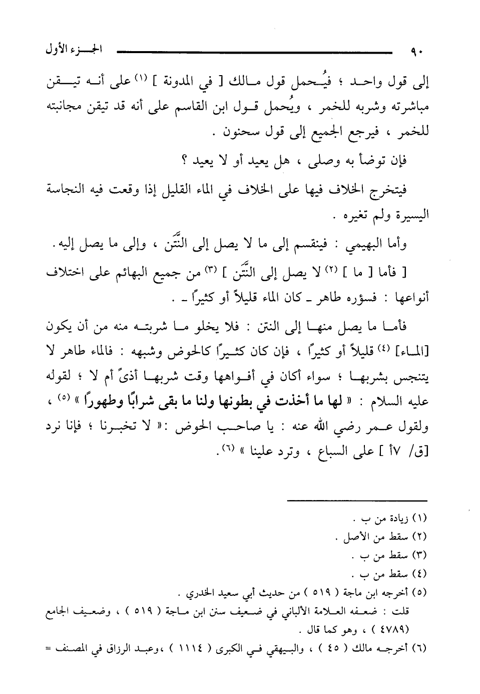 فأما ما يصل منها إلى النتن: فلا يخلو ما شربته منه من أن يكون [الماء] (¬4) قليلًا أو كثيرًا، فإن كان كثيرًا كالحوض وشبهه: فالماء طاهر لا يتنجس بشربها؛ سواء أكان في أفواهها وقت شربها أذىً أم لا؛ لقوله عليه السلام: "لها ما أخذت في بطونها ولنا ما بقى شرابًا وطهورًا" (¬5)، ولقول عمر رضي الله عنه: يا صاحب الحوض: "لا تخبرنا؛ فإنا نرد [ق/ 7 أ] على السباع، وترد علينا" (¬6).