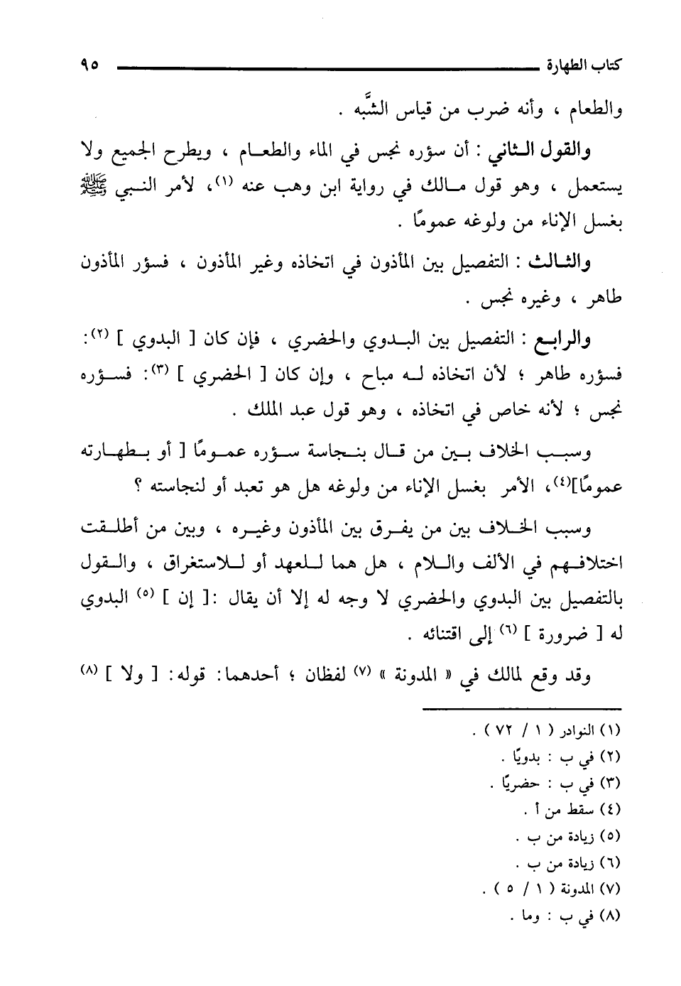 والرابع: التفصيل بين البدوي والحضري، فإن كان [البدوي] (¬2): فسؤره طاهر؛ لأن اتخاذه له مباح، وإن كان [الحضري] (¬3): فسؤره نجس؛ لأنه خاص في اتخاذه، وهو قول عبد الملك.